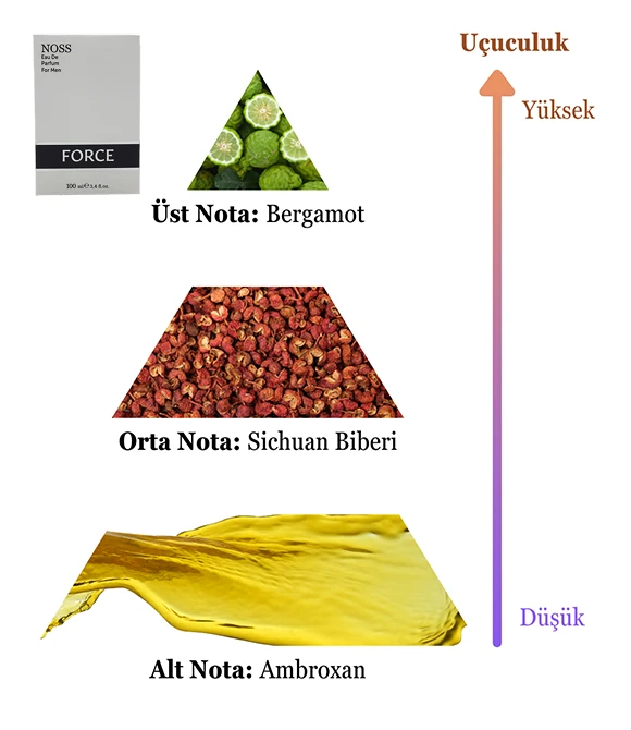 • Alt Nota – Ambroxan: Yoğun ve kalıcı kapanışıyla parfüme modern bir imza bırakır. Ambroxan’ın derinliği, FORCE’un prestijli ve çekici karakterini tamamlar.